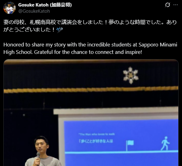 加藤豪将さんは、嫁(妻)ちかさんの母校・札幌南高校で講演会をしたことについてXで投稿しています。